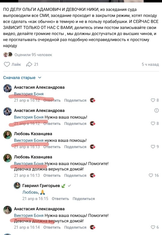 Повторюсь, к адвокату никаких вопросов — она отлично делает свою работу. В том числе и ограничивает доступ прессы к самой Ольге Адамович. Потому, что прабабушка иногда может сказать чего-то лишнего, что может сыграть не ей на пользу. К слову, именно тем же занимаются и «видные» новгородские общественные деятели, которые в буквальном смысле нападают на представителей прессы с криками, если те что-то не то спрашивают и говорят. Как я уже говорил, там кое-кого из этих деятелей признали иноагентами, их интерес тоже понятен — подогреться на «горячей теме» — раз это могут делать Мизулина с Кожевниковой, почему нельзя Черепановым (одна из сестер Черепановых признана в России иноагентом)?